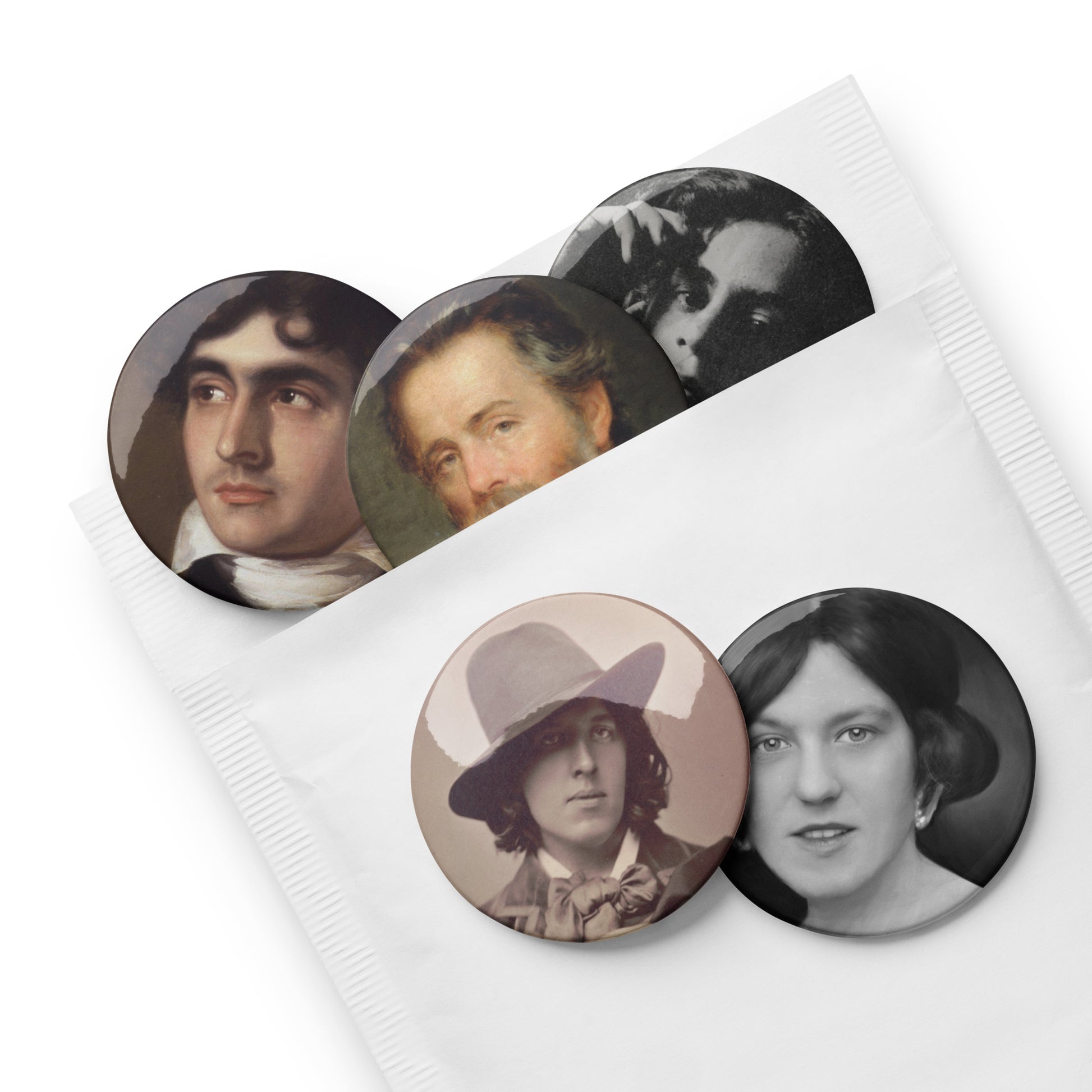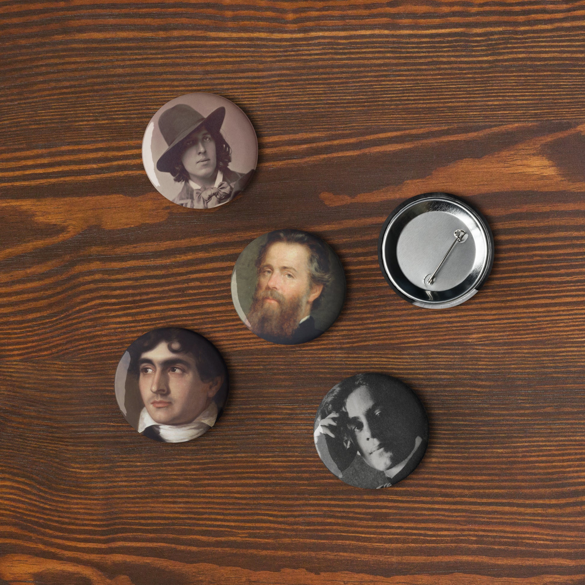 Authors - Oscar Wilde, Hope Mirrlees, Herman Melville, John Polidori, Kahlil Gibran Set of pin buttons